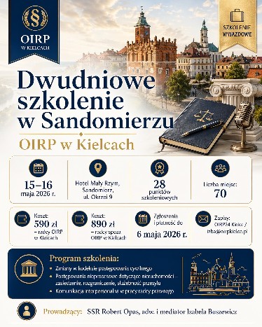 Koszt uczestnictwa w szkoleniu dla radców OIRP w Kielcach wynosi: 590,00 zł i obejmuje zakwaterowanie od 15.05 do 16.05.2026 r., pełne wyżywienie od obiadu w dniu 15 maja do śniadania w dniu 16 maja 2026 r. i inne koszty.