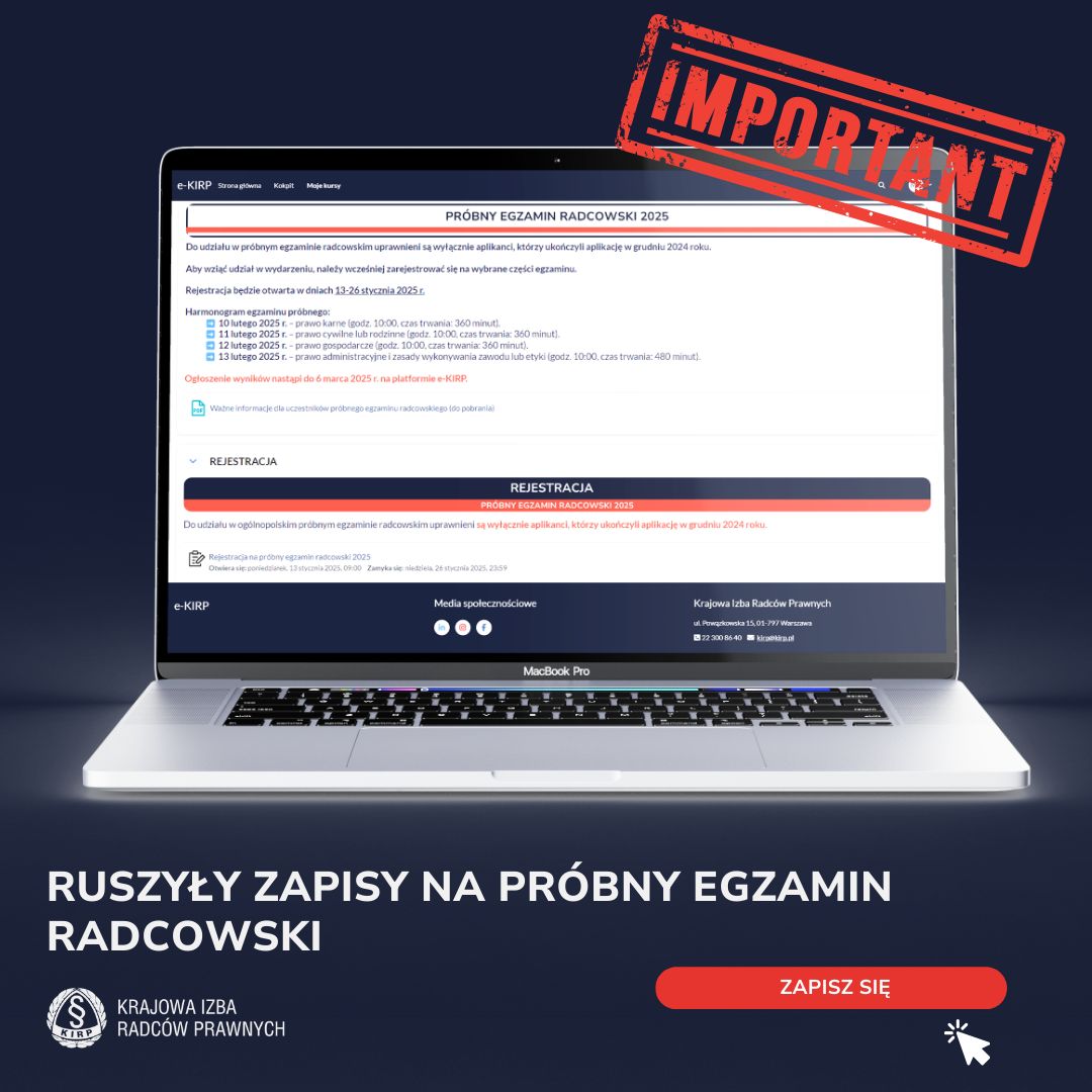 uprzejmie informujemy, że ruszyła rejestracja na próbny egzamin radcowski 2025. Głównym celem tego projektu jest umożliwienie aplikantom rzetelnej autoewaluacji ich przygotowań do egzaminu zawodowego, zapoznanie się ze specyficzną formą egzaminu oraz sprawdzenie swoich umiejętności w warunkach symulujących rzeczywisty egzamin.