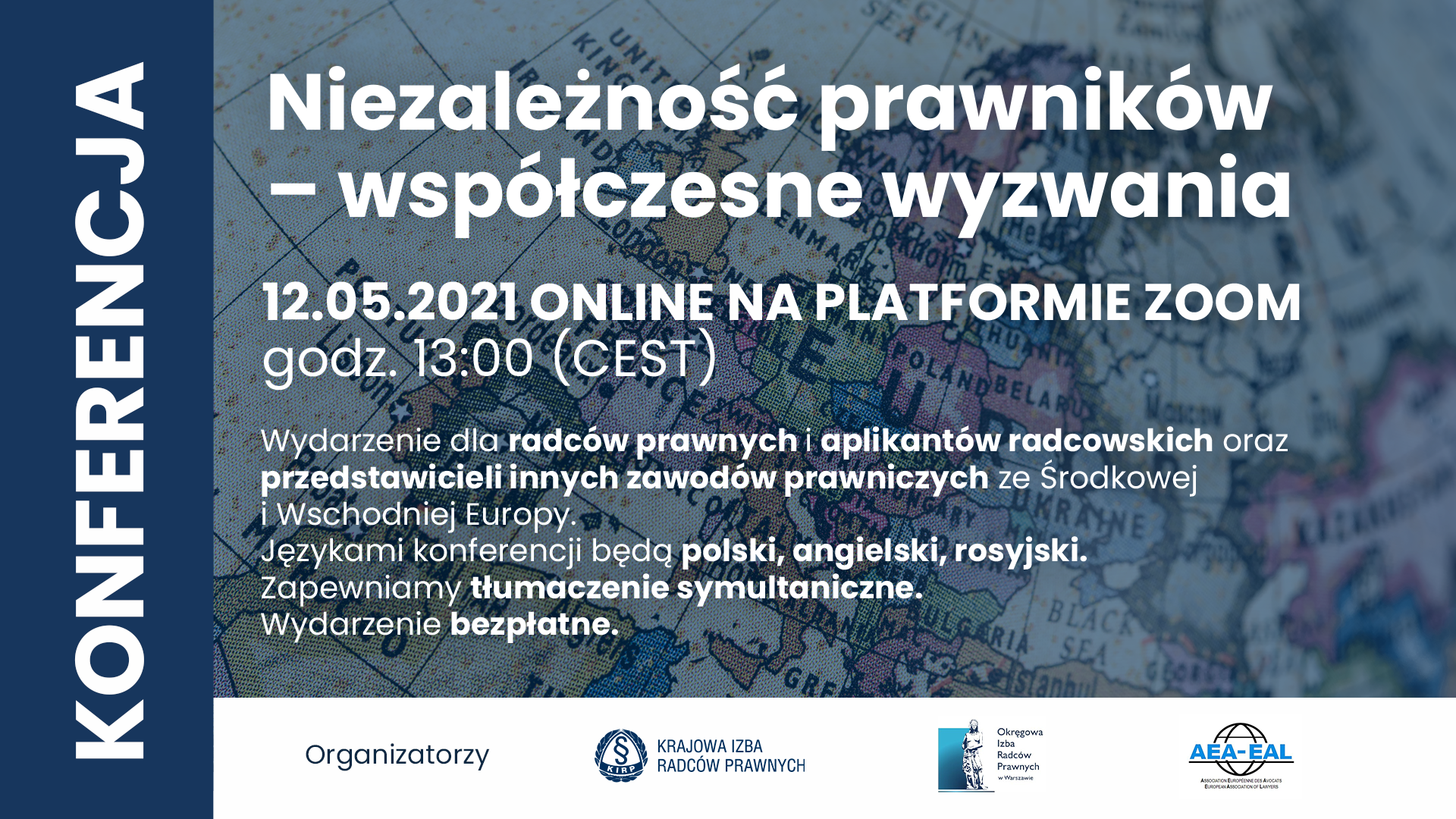w porozumieniu z Wiceprezesem KRRP Panem Michałem Korwek oraz Przewodniczącą Komisji Zagranicznej KRRP Panią Joanną Wisłą-Płonką przesyłam zaproszenie na konferencję online "Niezależność prawników - współczesne wyzwania". Wydarzenie odbędzie się w środę 12 maja br. w godz. 13.00-16.00 CEST na platformie Zoom. Poniżej załączam skrót najważniejszych informacji.