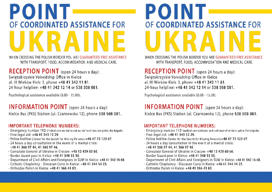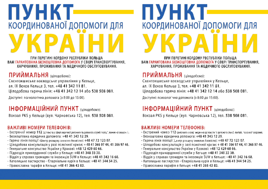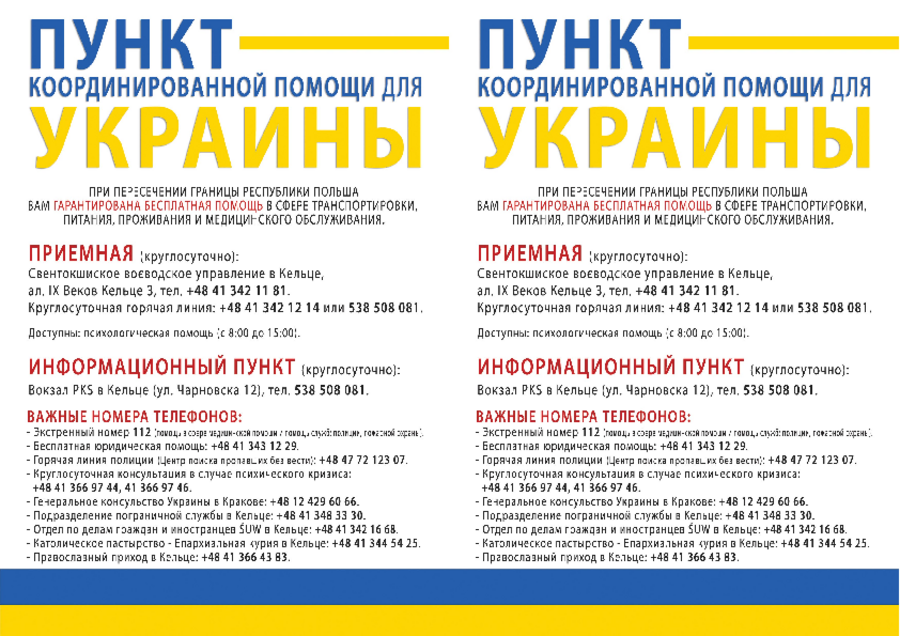 Якщо після прибуття у Польщу Ви бажаєте скористатися допомогою, запропонованою польським урядом, необхідно звернутися в один із перелічених нижче пунктів прийому громадян. У цих пунктах Ви отримаєте харчування, можливість відпочинку та необхідну інформацію.